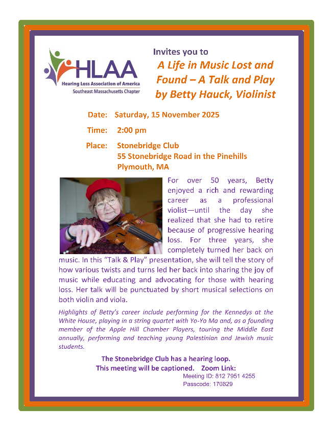 Veterans often experience hearing loss due to explosions and gunfire, prolonged exposure to aviation and other noises, ototoxic chemicals, or even traumatic brain injuries (TBI). To help these veterans, HLAA hosts a virtual (online) chapter dedicated to veterans with hearing loss. The group meets the 3rd Tuesday of the month. The November 18, 2025, meeting will focus on “No One Size Fits All: Real-World Tips & Tools for Navigating Hearing Loss.”